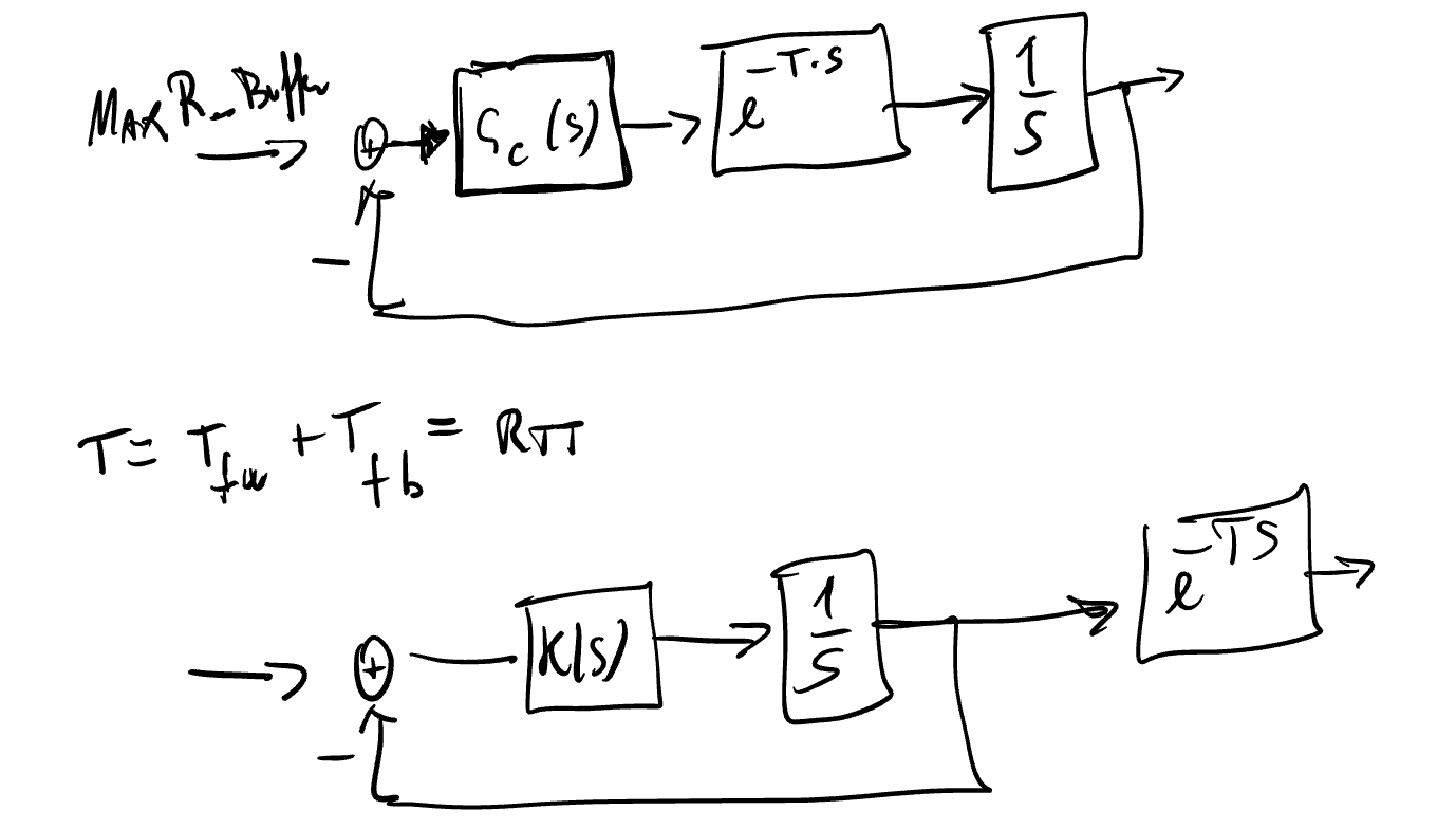 Il controllo di flusso è un'operazione che consente al mittente di regolare il proprio tasso di invio per adattarsi alla capacità del buffer del ricevitore (evitando così il buffer overflow) tramite la advertised window (awnd). L’ indica quanto spazio ha ancora a disposizione il buffer del ricevitore. Per modellare il controllo di flusso utilizziamo , , e , che rappresentano rispettivamente il tasso di ingresso, il tasso di uscita, il buffer disponibile e la lunghezza del buffer. Esistono inoltre due ritardi: uno per l’inoltro (forwarding) e uno per il ritorno (feedback) dell’ al mittente (modellati come , dove è la somma dei due tempi). Il processo fisico è modellato come un integratore.