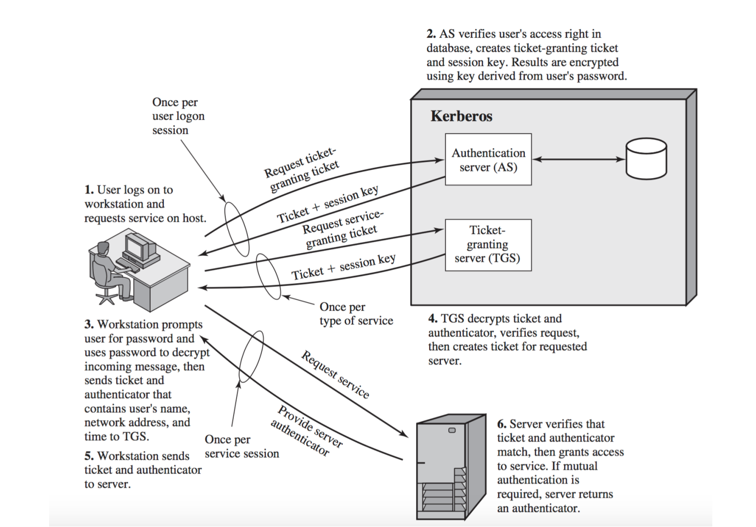 - L’AS cripta tutto questo usando una chiave derivata dalla password dell’utente (che l’AS conosce). Questo pacchetto viene inviato indietro alla workstation.