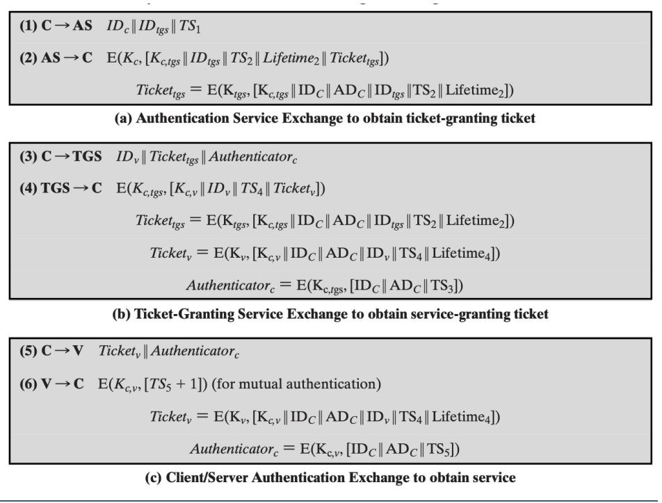 - Un Authenticator: Un piccolo pacchetto cifrato con la chiave di sessione che contiene l’ID e l’ora corrente (), per provare che è proprio lui a usare il ticket e non un hacker che lo ha rubato.