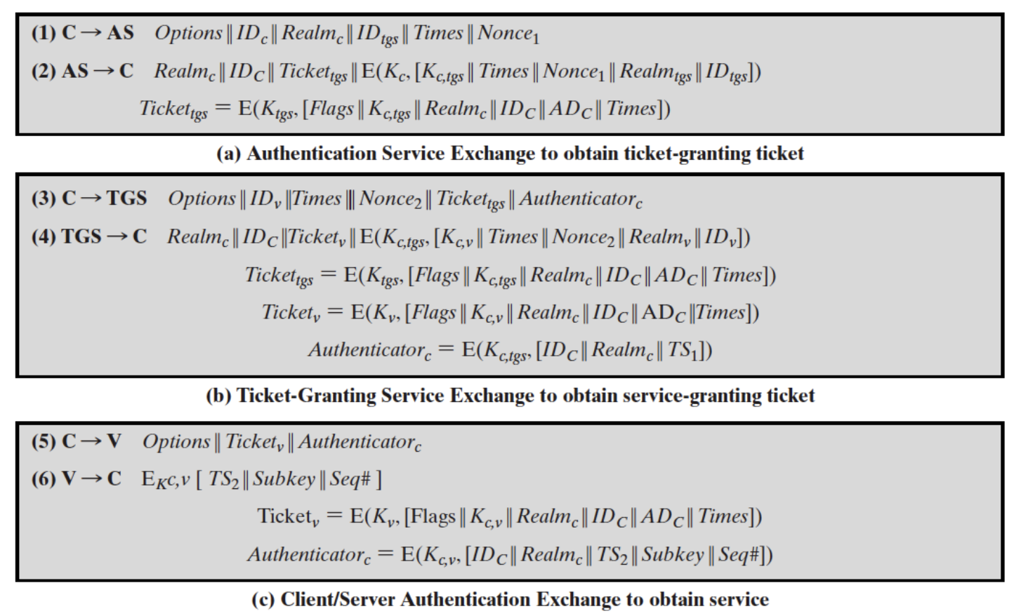 - L’Authenticator: Contiene il nome e l’orario, cifrati con la chiave di sessione () che ha dato l’AS nel passaggio 2.