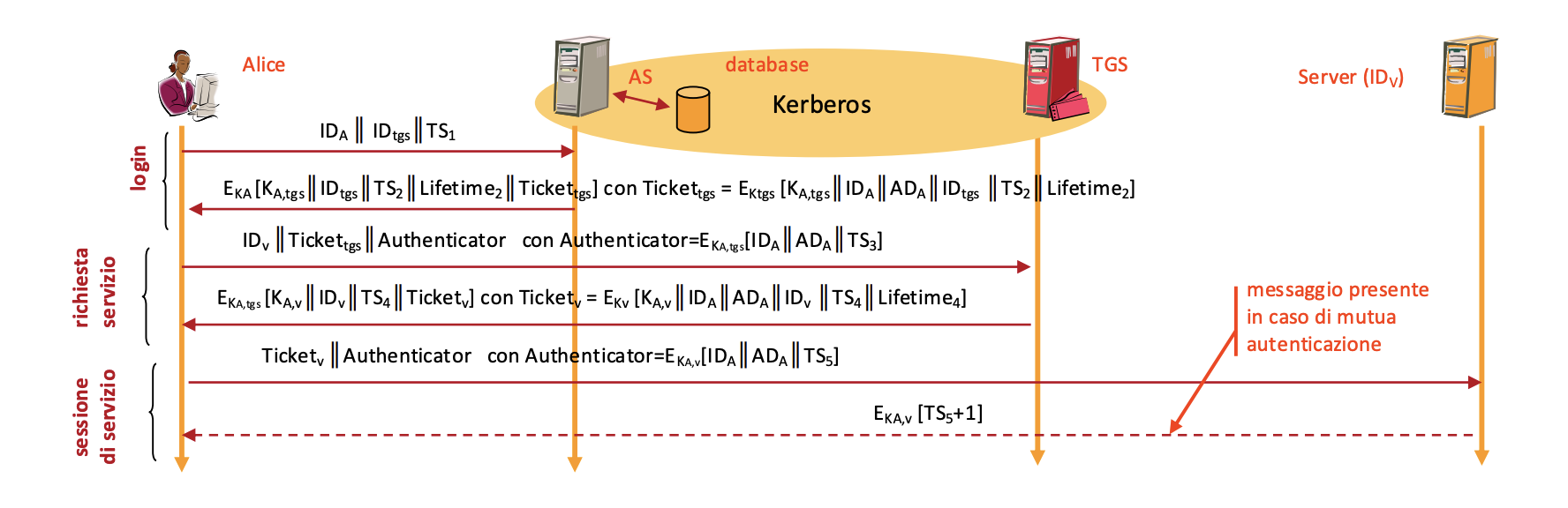 - Se il messaggio (6) è presente (come nell’immagine), significa che c’è Autenticazione Mutua: il server risponde al client confermando l’orario () per dire “Sì, sono veramente il server che cercavi e ho accettato il tuo ticket”.