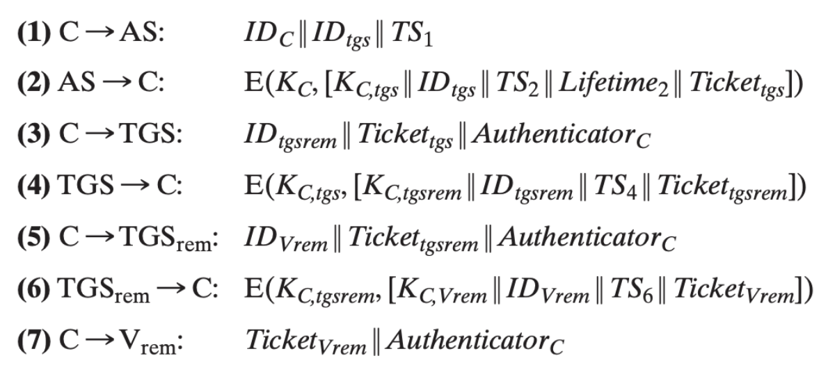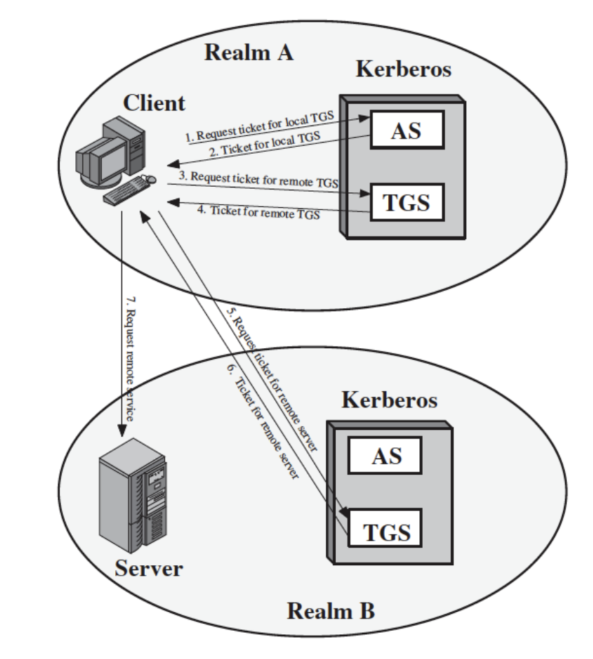 La differenza principale risiede nell’interazione (4), nella quale la chiave effimera utilizzata non è la Kc,v, condivisa tra il client e il server remoto, bensì una nuova chiave effimera Kc,tgs, condivisa tra il client e il Ticket Granting Server presente nel dominio di destinazione del server.
