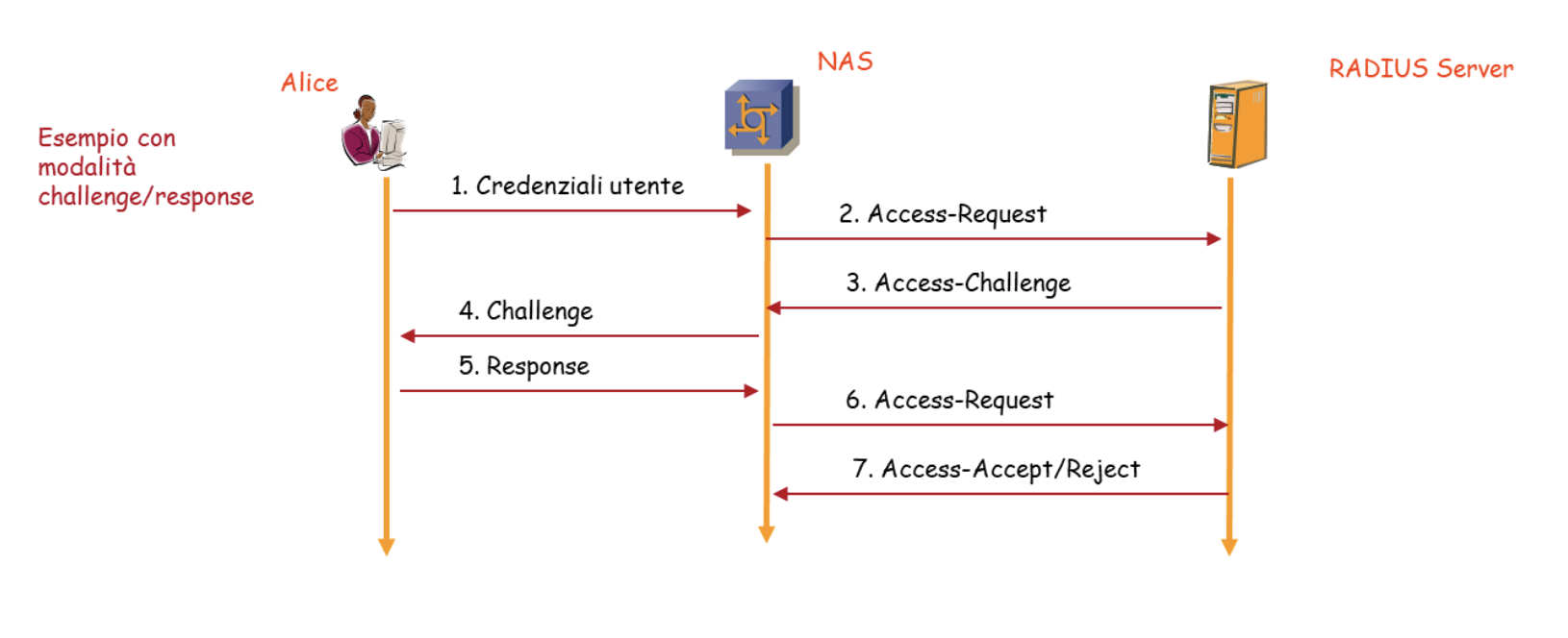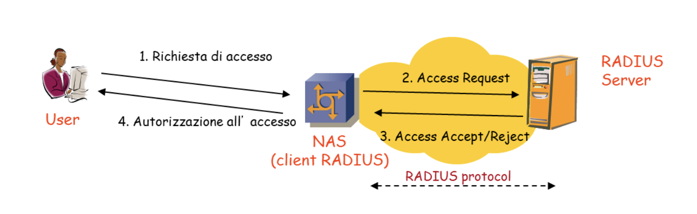 PAP (Password Authentication Protocol): È un metodo di autenticazione debole. La password è vulnerabile a intercettazioni e replay attack se non protetta da un canale sicuro sottostante. Il NAS riceve le credenziali dell’utente, ma non possedendo il database degli utenti, non sa se le credenziali sono corrette. Impacchetta le credenziali in un messaggio tramite una funzione hash MD5 chiamata Access-Request che invia al Server. Il server fornisce in risposta il messaggio di accettazione o rifiuto.