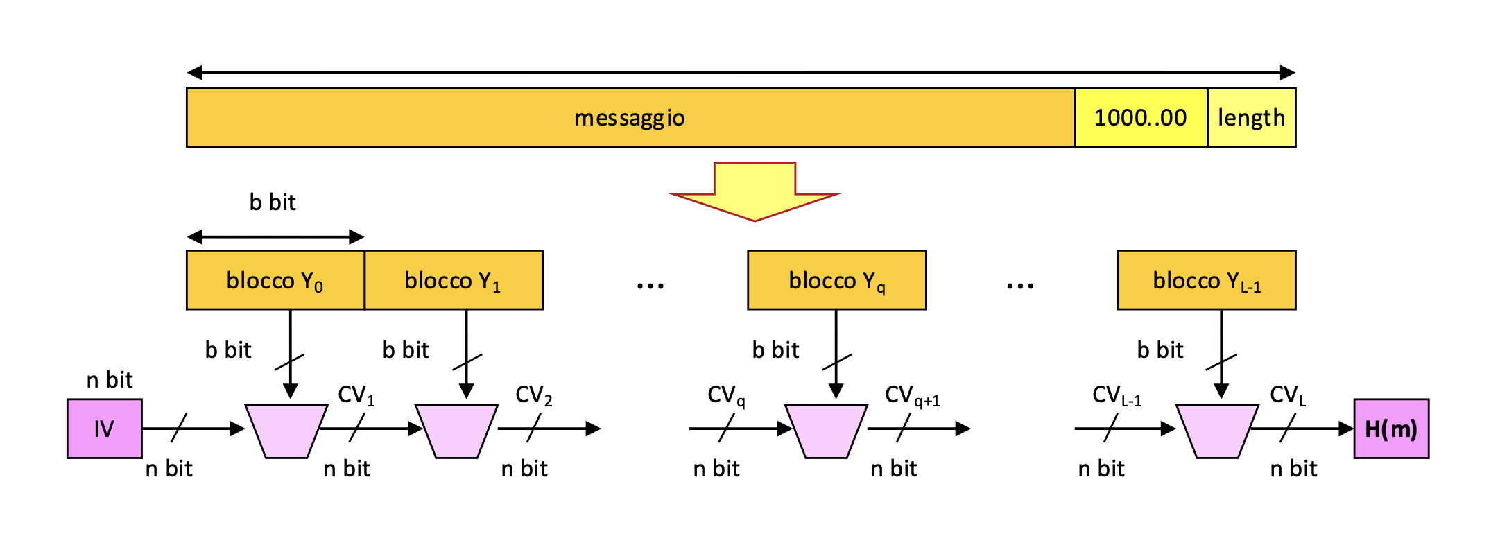 Come prima cosa si allunga il messaggio in modo che la sua lunghezza sia un multiplo della dimensione del blocco. Si parte da un valore fisso chiamato IV (Initial Value) e poi per ogni blocco del messaggio M_i, si calcola dove è la funzione di compressione.