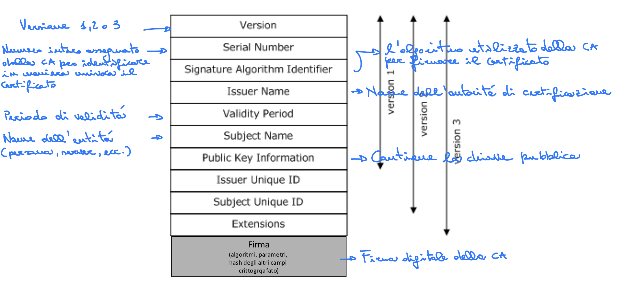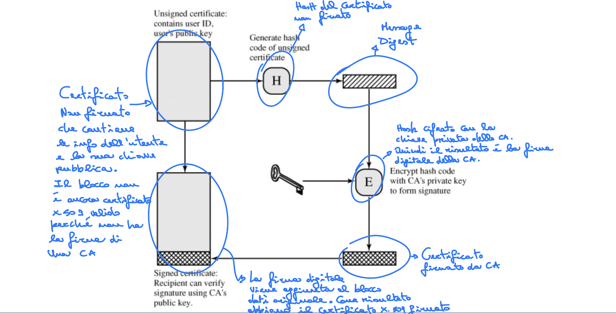 I certificati X.509 sono lo strumento centrale che la PKI (public-key-certificates) utilizza per fornire un metodo sicuro, affidabile e scalabile per la distribuzione delle chiavi pubbliche, garantendo segretezza, correttezza e verifica del mittente. Il certificato X.509 ha il ruolo cruciale di “legare” (bind) il proprietario alla chiave pubblica. Al centro dello schema X.509 si trova il certificato a chiave pubblica associato a ciascun utente, che si assume sia creato da una Certification Authority (CA) fidata. Un certificato lega l’identità alla chiave pubblica, includendo anche altre informazioni come il periodo di validità e i diritti di utilizzo. La sicurezza del certificato è garantita dal fatto che esso è autenticato tramite una crittografia asimmetrica (ad esempio RSA) del suo hash.